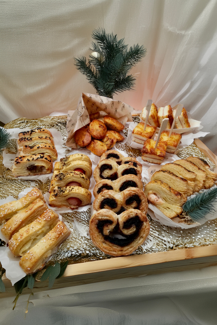 Un assortiment composé de madeleines aux olives, tomates séchées et parmesan, mini croque-monsieur, roulés à la saucisse, feuilletés à l’emmental, feuilletés au bleu et noix, ainsi que feuilletés saumon.